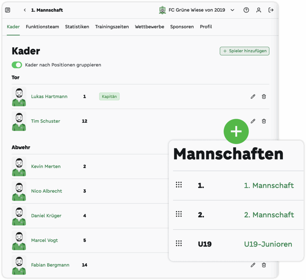 Die Vorstellung der Teams ist ein zentraler Bestandteil jedes starken Online-Auftritts eines Sportvereins. Mit ClubShare legst du Spieler:innen und das Funktionsteam strukturiert an und präsentierst alle relevanten Infos auf einer professionellen Teamseite – übersichtlich, modern und mobiloptimiert.