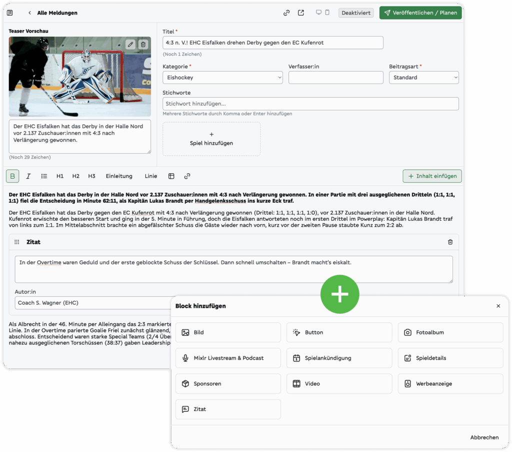 Ihr könnt Spiele & Tabellen selbst pflegen oder – je nach Anbieter – per Widget/Embed integrieren. Drittelstände, OT/SO und Boxscore-Elemente lassen sich pro Spiel ergänzen.